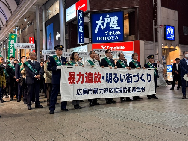全商協加盟の中国遊商は、12月1日、昨年に引き続き広島市暴力追放監視防犯連合会主催の暴力団排除を呼びかける街頭パレード等に山本理事長以下52名が参加しました。街頭パレードに先立ち、広島県民文化センター大ホールで開かれた総決起大会では、同連合会新田泰和会長が、特殊詐欺や匿名流動型犯罪に触れ、「関係機関と連携強化して追放活動をする」と参加者へ決意表明されました。